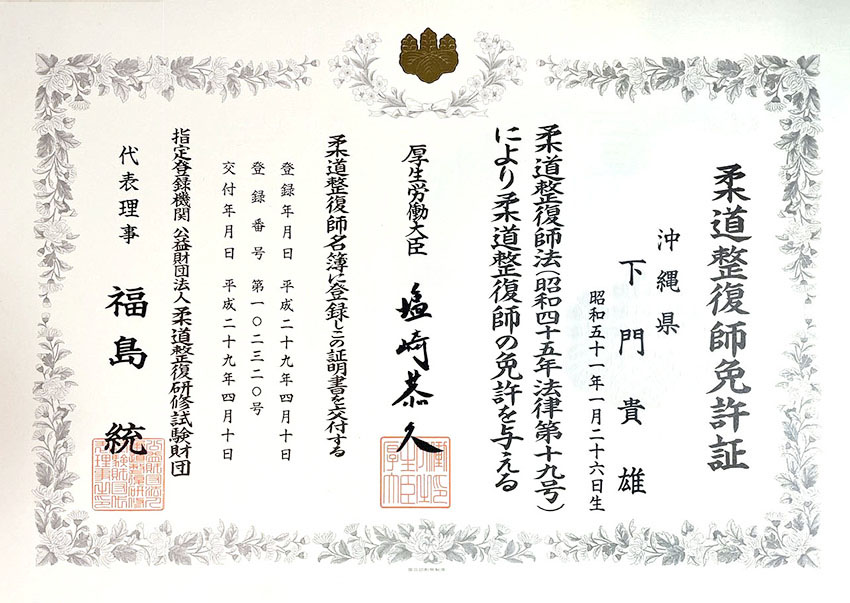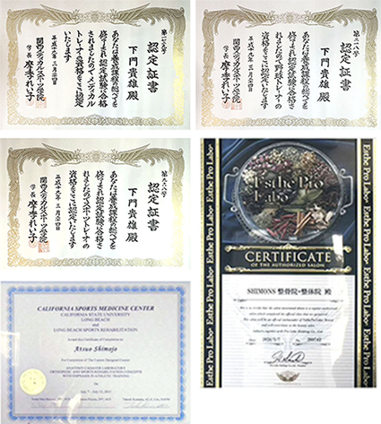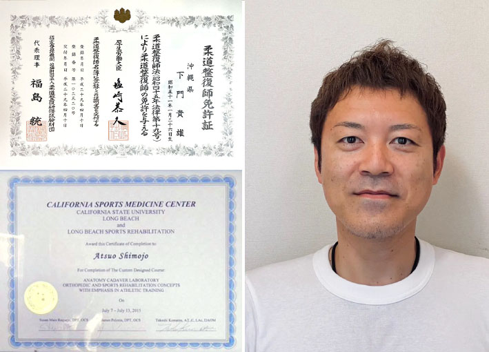 また、院長の下門はメディカルトレーナー、スポーツトレーナー、野球トレーナーの養成課程を修了し、スポーツメディカルに精通しています。スポーツ工学からの視点からの体のメンテナンスに精通しています。カリフォルニア・スポーツ医学センターとカリフォルニア州立大学ロングビーチ校、ロングビーチ・スポーツリハビリテーションにて解剖学、運動学、スポーツリハビリテーション学を修了。